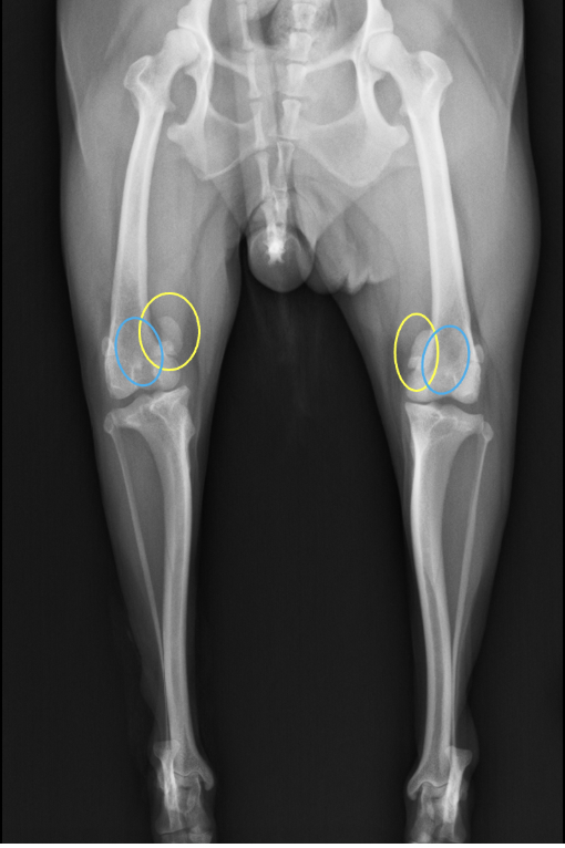 △両方ともに膝蓋骨が外れてしまっているレントゲンです。黄色が膝蓋骨です。正しくは水色部分に位置していなければなりません。