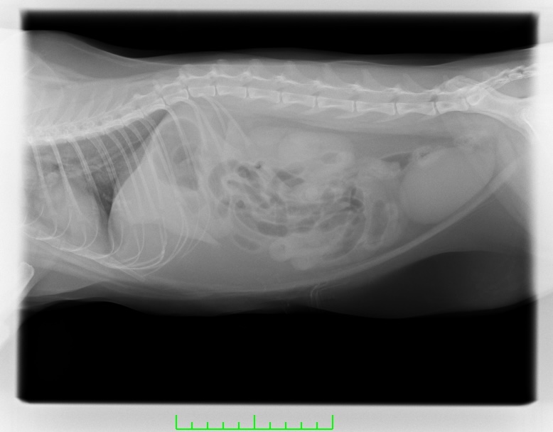 飼い主さまからの稟告で「もともと紐を舐めたり齧る癖があり、細い紐で遊んでいた可能性がある」とあり、紐状異物を疑って精査を進めました。